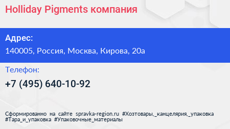 Holliday Pigments, компания по адресу 140005, Россия, Москва, Кирова, 20а в дальнейшем Организация, размещена в следующих категориях: