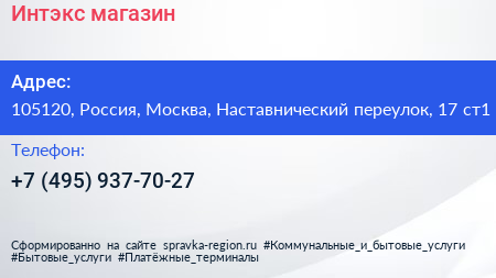 Интэкс, магазин по адресу 105120, Россия, Москва, Наставнический переулок, 17 ст1 в дальнейшем Организация, размещена в следующих категориях: