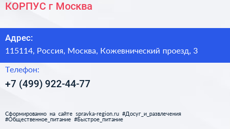 КОРПУС, г. Москва по адресу 115114, Россия, Москва, Кожевнический проезд, 3 в дальнейшем Организация, размещена в следующих категориях: