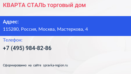 КВАРТА-СТАЛЬ, торговый дом по адресу 115280, Россия, Москва, Мастеркова, 4 в дальнейшем Организация, размещена в следующих категориях: