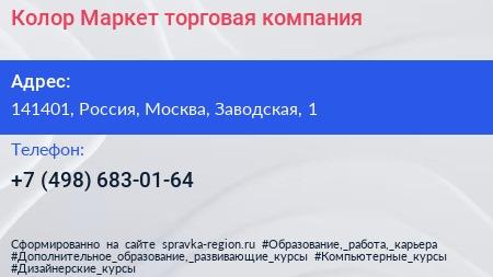 Колор Маркет, торговая компания по адресу 141401, Россия, Москва, Заводская, 1 в дальнейшем Организация, размещена в следующих категориях:
