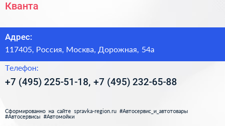 Кванта по адресу 117405, Россия, Москва, Дорожная, 54а в дальнейшем Организация, размещена в следующих категориях: