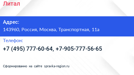 Литал по адресу 143960, Россия, Москва, Транспортная, 11а в дальнейшем Организация, размещена в следующих категориях: