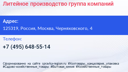 Литейное производство, группа компаний по адресу 125319, Россия, Москва, Черняховского, 4 в дальнейшем Организация, размещена в следующих категориях:
