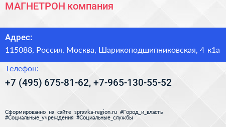 МАГНЕТРОН, компания по адресу 115088, Россия, Москва, Шарикоподшипниковская, 4 к1а в дальнейшем Организация, размещена в следующих категориях: