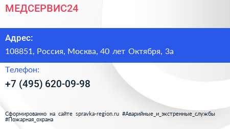 МЕДСЕРВИС24 по адресу 108851, Россия, Москва, 40 лет Октября, 3а в дальнейшем Организация, размещена в следующих категориях: