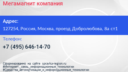 Мегамагнит, компания по адресу 127254, Россия, Москва, проезд Добролюбова, 8а ст1 в дальнейшем Организация, размещена в следующих категориях: