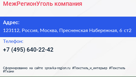 МежРегионУголь, компания по адресу 123112, Россия, Москва, Пресненская Набережная, 6 ст2 в дальнейшем Организация, размещена в следующих категориях: