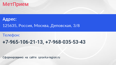 МетПрием по адресу 125635, Россия, Москва, Деповская, 3/8 в дальнейшем Организация, размещена в следующих категориях: