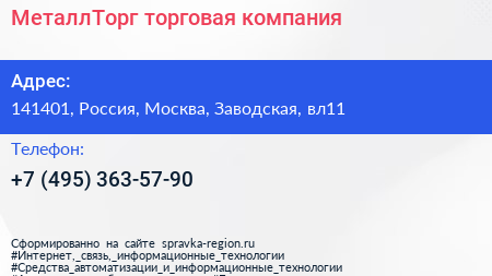 МеталлТорг, торговая компания по адресу 141401, Россия, Москва, Заводская, вл11 в дальнейшем Организация, размещена в следующих категориях: