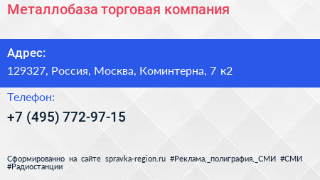 Металлобаза, торговая компания по адресу 129327, Россия, Москва, Коминтерна, 7 к2 в дальнейшем Организация, размещена в следующих категориях: