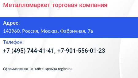 Металломаркет, торговая компания по адресу 143960, Россия, Москва, Фабричная, 7а в дальнейшем Организация, размещена в следующих категориях: