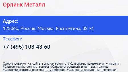 Орлинк Металл по адресу 123060, Россия, Москва, Расплетина, 32 к1 в дальнейшем Организация, размещена в следующих категориях: