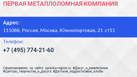 ПЕРВАЯ МЕТАЛЛОЛОМНАЯ КОМПАНИЯ по адресу 115088, Россия, Москва, Южнопортовая, 21 ст11 в дальнейшем Организация, размещена в следующих категориях: