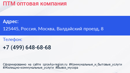ПТМ, оптовая компания по адресу 125445, Россия, Москва, Валдайский проезд, 8 в дальнейшем Организация, размещена в следующих категориях: