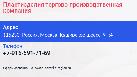 Пластизделия, торгово-производственная компания по адресу 115230, Россия, Москва, Каширское шоссе, 9 к4 в дальнейшем Организация, размещена в следующих категориях: