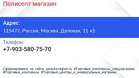 Полисепт, магазин по адресу 115477, Россия, Москва, Деловая, 11 к1 в дальнейшем Организация, размещена в следующих категориях: