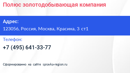Полюс, золотодобывающая компания по адресу 123056, Россия, Москва, Красина, 3 ст1 в дальнейшем Организация, размещена в следующих категориях: