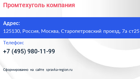 Промтехуголь, компания по адресу 125130, Россия, Москва, Старопетровский проезд, 7а ст25 в дальнейшем Организация, размещена в следующих категориях: