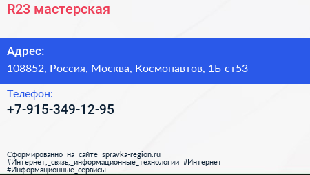 R23, мастерская по адресу 108852, Россия, Москва, Космонавтов, 1Б ст53 в дальнейшем Организация, размещена в следующих категориях: