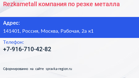 Rezkametall, компания по резке металла по адресу 141401, Россия, Москва, Рабочая, 2а к1 в дальнейшем Организация, размещена в следующих категориях: