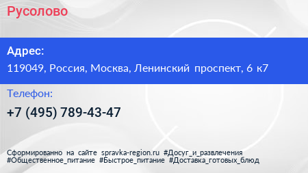 Русолово по адресу 119049, Россия, Москва, Ленинский проспект, 6 к7 в дальнейшем Организация, размещена в следующих категориях: