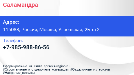 Саламандра по адресу 115088, Россия, Москва, Угрешская, 2Б ст2 в дальнейшем Организация, размещена в следующих категориях: