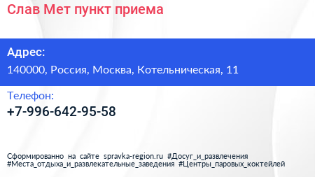 Слав-Мет, пункт приема по адресу 140000, Россия, Москва, Котельническая, 11 в дальнейшем Организация, размещена в следующих категориях: