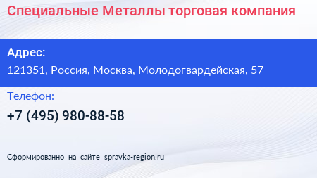 Специальные Металлы, торговая компания по адресу 121351, Россия, Москва, Молодогвардейская, 57 в дальнейшем Организация, размещена в следующих категориях:
