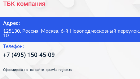 ТБК, компания по адресу 125130, Россия, Москва, 6-й Новоподмосковный переулок, 10 в дальнейшем Организация, размещена в следующих категориях: