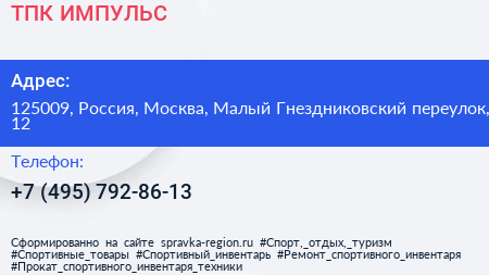 ТПК ИМПУЛЬС по адресу 125009, Россия, Москва, Малый Гнездниковский переулок, 12 в дальнейшем Организация, размещена в следующих категориях: