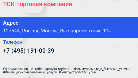 ТСК, торговая компания по адресу 127644, Россия, Москва, Вагоноремонтная, 10а в дальнейшем Организация, размещена в следующих категориях: