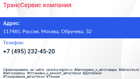ТрансСервис, компания по адресу 117485, Россия, Москва, Обручева, 32 в дальнейшем Организация, размещена в следующих категориях:
