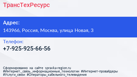 ТрансТехРесурс по адресу 143966, Россия, Москва, улица Новая, 3 в дальнейшем Организация, размещена в следующих категориях: