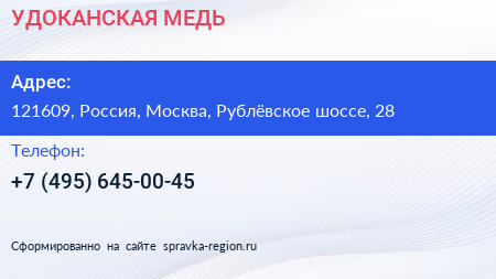 УДОКАНСКАЯ МЕДЬ по адресу 121609, Россия, Москва, Рублёвское шоссе, 28 в дальнейшем Организация, размещена в следующих категориях: