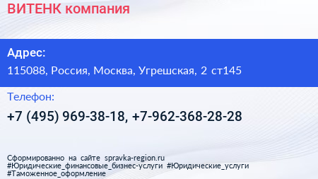 ВИТЕНК, компания по адресу 115088, Россия, Москва, Угрешская, 2 ст145 в дальнейшем Организация, размещена в следующих категориях: