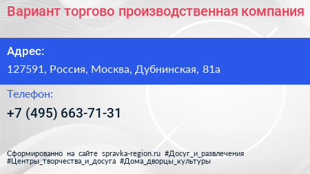 Вариант, торгово-производственная компания по адресу 127591, Россия, Москва, Дубнинская, 81а в дальнейшем Организация, размещена в следующих категориях: