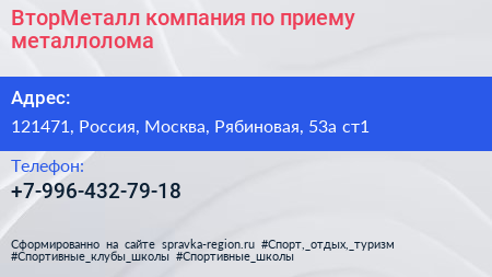 ВторМеталл, компания по приему металлолома по адресу 121471, Россия, Москва, Рябиновая, 53а ст1 в дальнейшем Организация, размещена в следующих категориях: