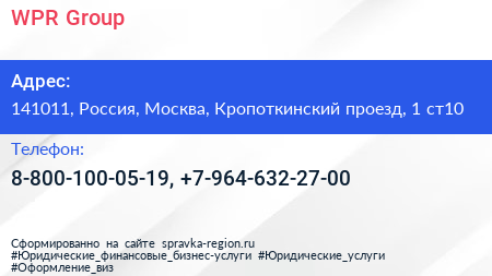 WPR Group по адресу 141011, Россия, Москва, Кропоткинский проезд, 1 ст10 в дальнейшем Организация, размещена в следующих категориях: