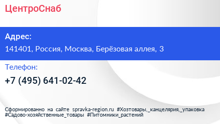 ЦентроСнаб по адресу 141401, Россия, Москва, Берёзовая аллея, 3 в дальнейшем Организация, размещена в следующих категориях: