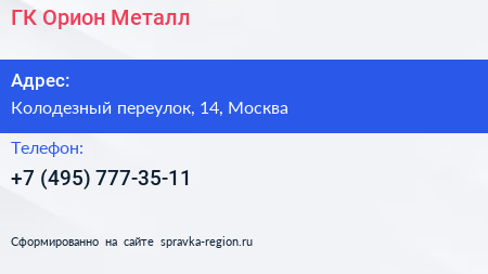 ГК «Орион Металл» по адресу Колодезный переулок, 14, Москва в дальнейшем Организация, размещена в следующих категориях: