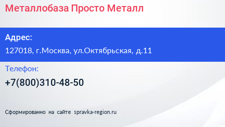 Металлобаза - Просто Металл по адресу 127018, г.Москва, ул.Октябрьская, д.11 в дальнейшем Организация, размещена в следующих категориях: