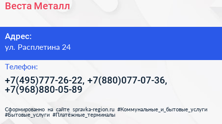 Веста Металл по адресу ул. Расплетина 24 в дальнейшем Организация, размещена в следующих категориях: