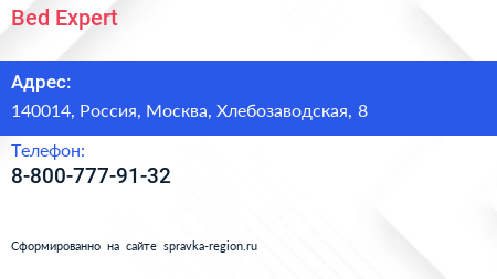 Bed. Expert по адресу 140014, Россия, Москва, Хлебозаводская, 8 в дальнейшем Организация, размещена в следующих категориях: