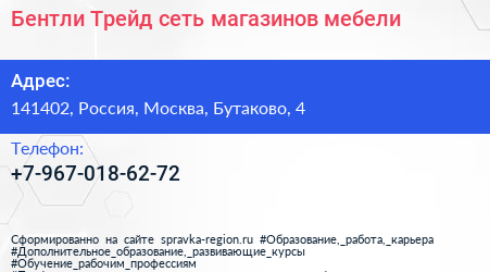 Бентли Трейд, сеть магазинов мебели по адресу 141402, Россия, Москва, Бутаково, 4 в дальнейшем Организация, размещена в следующих категориях: