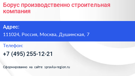 Борус, производственно-строительная компания по адресу 111024, Россия, Москва, Душинская, 7 в дальнейшем Организация, размещена в следующих категориях: