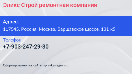Эликс Строй, ремонтная компания по адресу 117545, Россия, Москва, Варшавское шоссе, 131 к5 в дальнейшем Организация, размещена в следующих категориях: