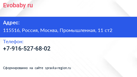 Evobaby.ru по адресу 115516, Россия, Москва, Промышленная, 11 ст2 в дальнейшем Организация, размещена в следующих категориях: