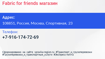 Fabric for friends, магазин по адресу 108851, Россия, Москва, Спортивная, 23 в дальнейшем Организация, размещена в следующих категориях: