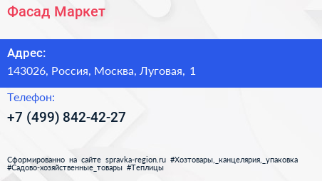 Фасад-Маркет по адресу 143026, Россия, Москва, Луговая, 1 в дальнейшем Организация, размещена в следующих категориях: